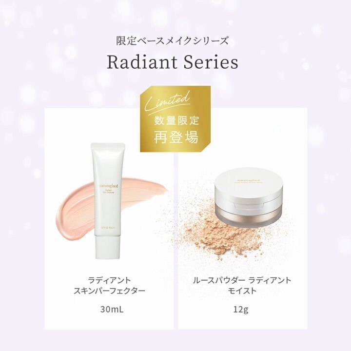 毎年大好評のナチュラグラッセ ラディアントシリーズが今年も数量限定発売! 天然由来成分100%&石けんオフでお肌にやさしい♡ 透明感と自然な血色感を演出し素肌感のあるつや肌に! ラディアントスキンパーフェクターN ¥3,850(税込) ルースパウダーラディアントモイストN ¥4,950(税込)