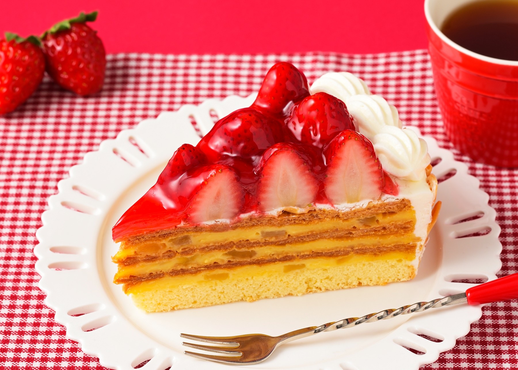 ホワイトチョコがけしたパイ生地と、ほどよい酸味の苺ジャム、コクのあるカスタード入りバタークリーム(ムースリーヌ)を重ねました。さくさく食感のパイ生地と、風味豊かなクリーム、甘ずっぱい苺の相性抜群の組み合わせをお楽しみください。