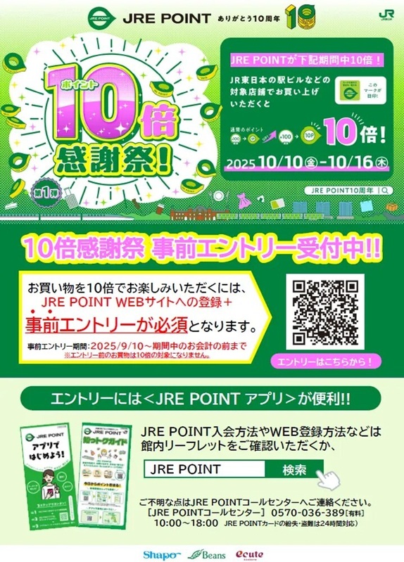 対象期間中にビーンズ中山を含むJR東日本エリアの駅ビルなどの対象店舗でお買いものすると、