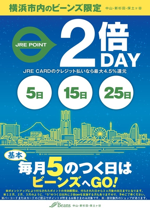 【基本】“5”のつく日、5日、15日、25日はJRE POINT2倍DAY!|トピックス|ビーンズ中山 | JR横浜線「中山駅」直結のショッピングセンター