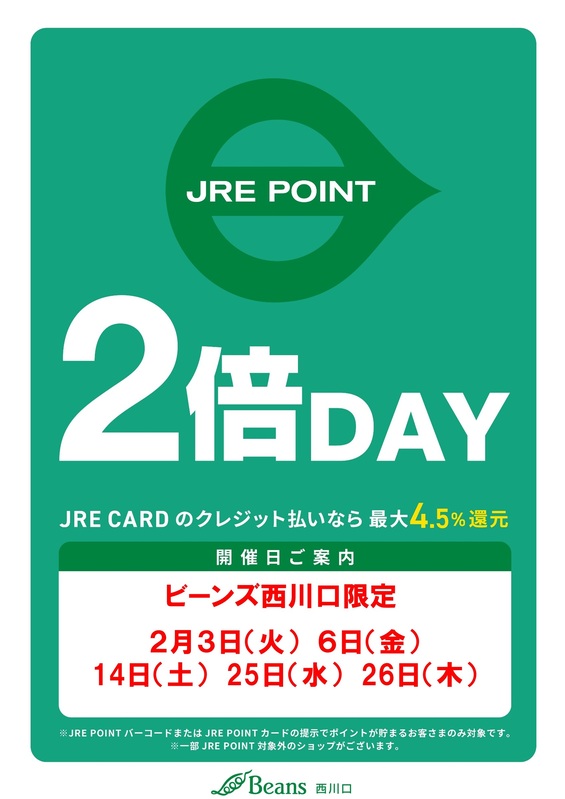 2月度JRE POINT2倍DAYスケジュール|トピックス|ビーンズ西川口 | JR京浜東北線「西川口駅」直結のショッピングセンター