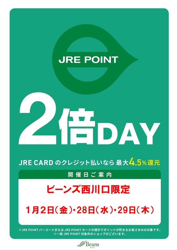 1月度JRE POINT2倍DAYスケジュール|トピックス|ビーンズ西川口 | JR京浜東北線「西川口駅」直結のショッピングセンター