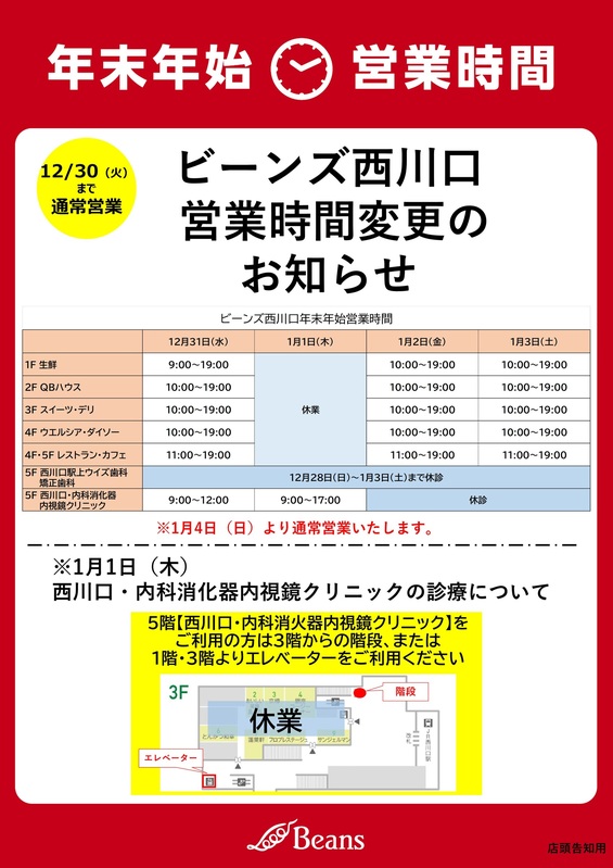 ビーンズ西川口 年末年始営業時間のお知らせ