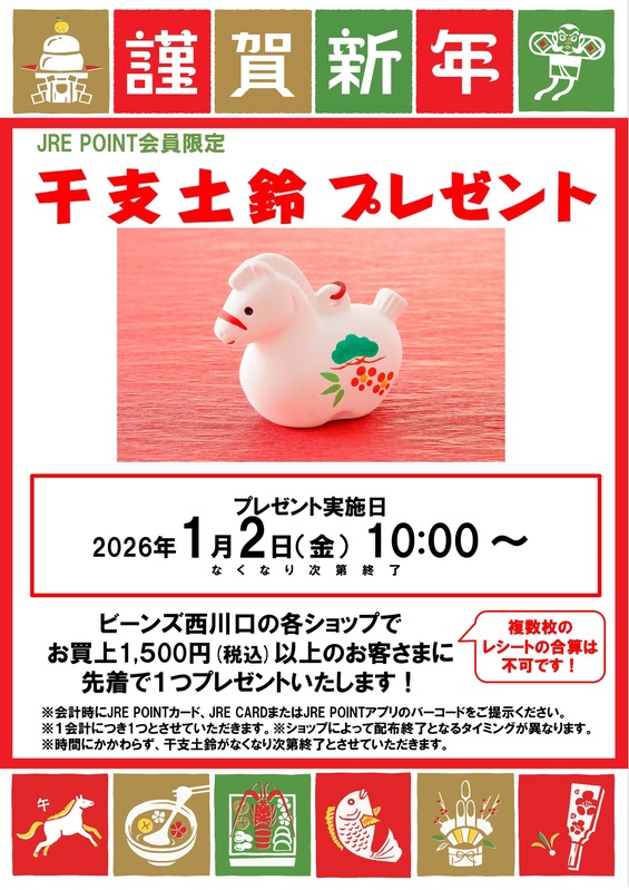 トピックス 【JRE POINT会員限定】干支土鈴プレゼント 新年初営業日より1回のお買い上げ金額1,500円(税込)以上のお客様に先着でお一つプレゼントします。各ショップなくなり次第終了となりますので、ご了承ください。 tweetする Facebookでシェアする LINEで送る