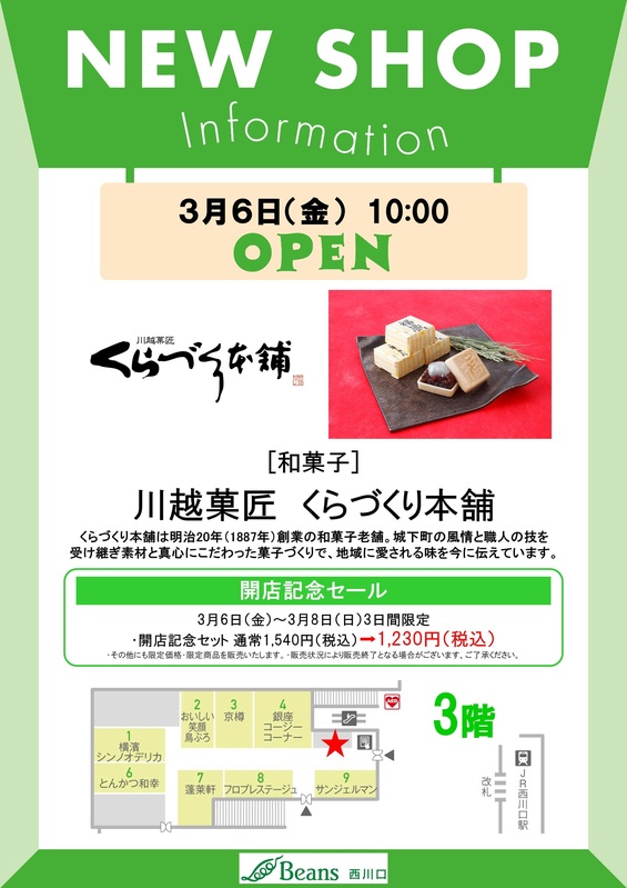 トピックス 【NEW SHOP】川越菓匠 くらづくり本舗 3月6日(金)10時にビーンズ西川口3階にOPEN。3月6日(金)~8日(日)の3日間、開店記念セットの販売や数量限定商品等を販売致します。 tweetする Facebookでシェアする LINEで送る