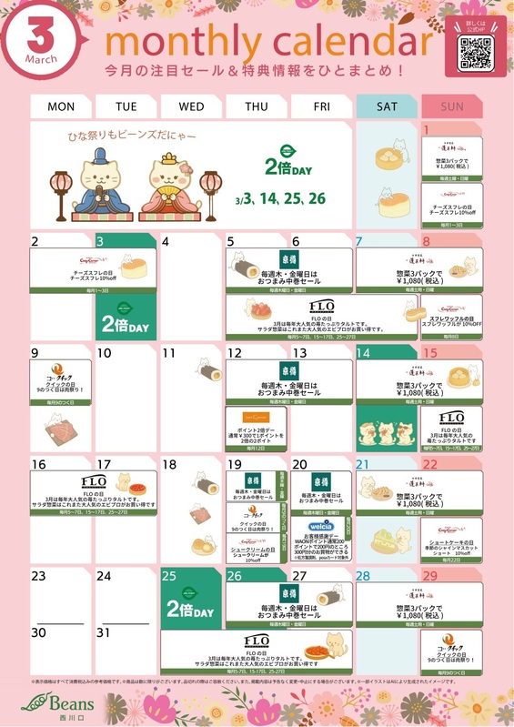 トピックス 3月マンスリーカレンダー ぜひ、お立ち寄りください♪ 3月のビーンズ西川口マンスリーカレンダーです。皆様のご来店お待ちしております!! tweetする Facebookでシェアする LINEで送る