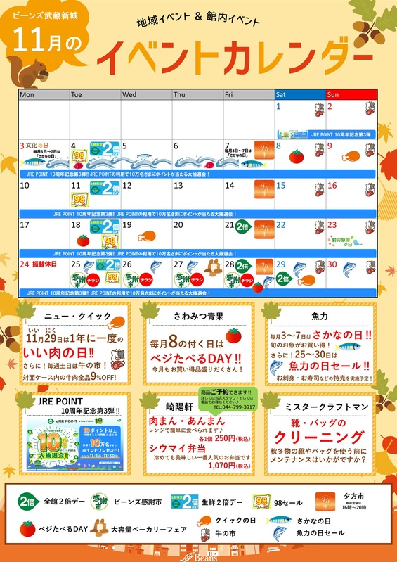 トピックス 11月イベントカレンダー★ JRE POINT2倍デーやセール情報など、オトク情報がたくさんつまっています♪ぜひビーンズ武蔵新城でお買物をお楽しみください!〔詳しくは画像をクリック!〕 <備考・注意事項> 内容は予告なく変更となる場合があります。ご了承ください。 tweetする Facebookでシェアする LINEで送る