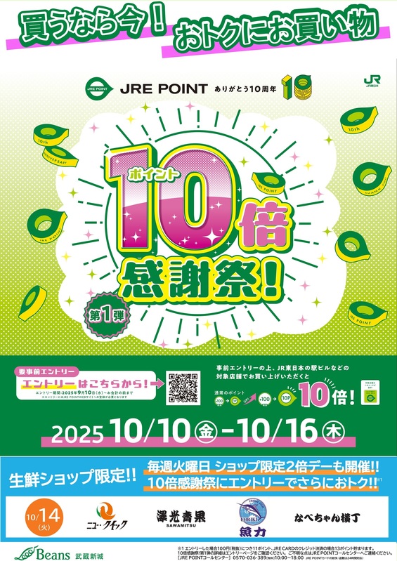 対象期間中にビーンズ武蔵新城を含むJR東日本エリアの駅ビルなどの対象店舗でお買いものすると、