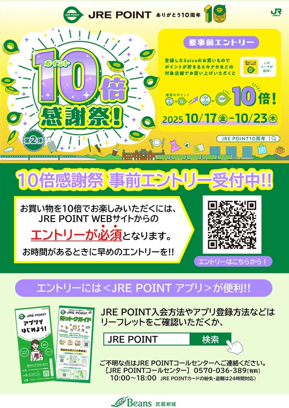 ※2025年9月30日をもって、ビーンズ武蔵新城でのJRE POINTカード入会受付は終了いたしました。
