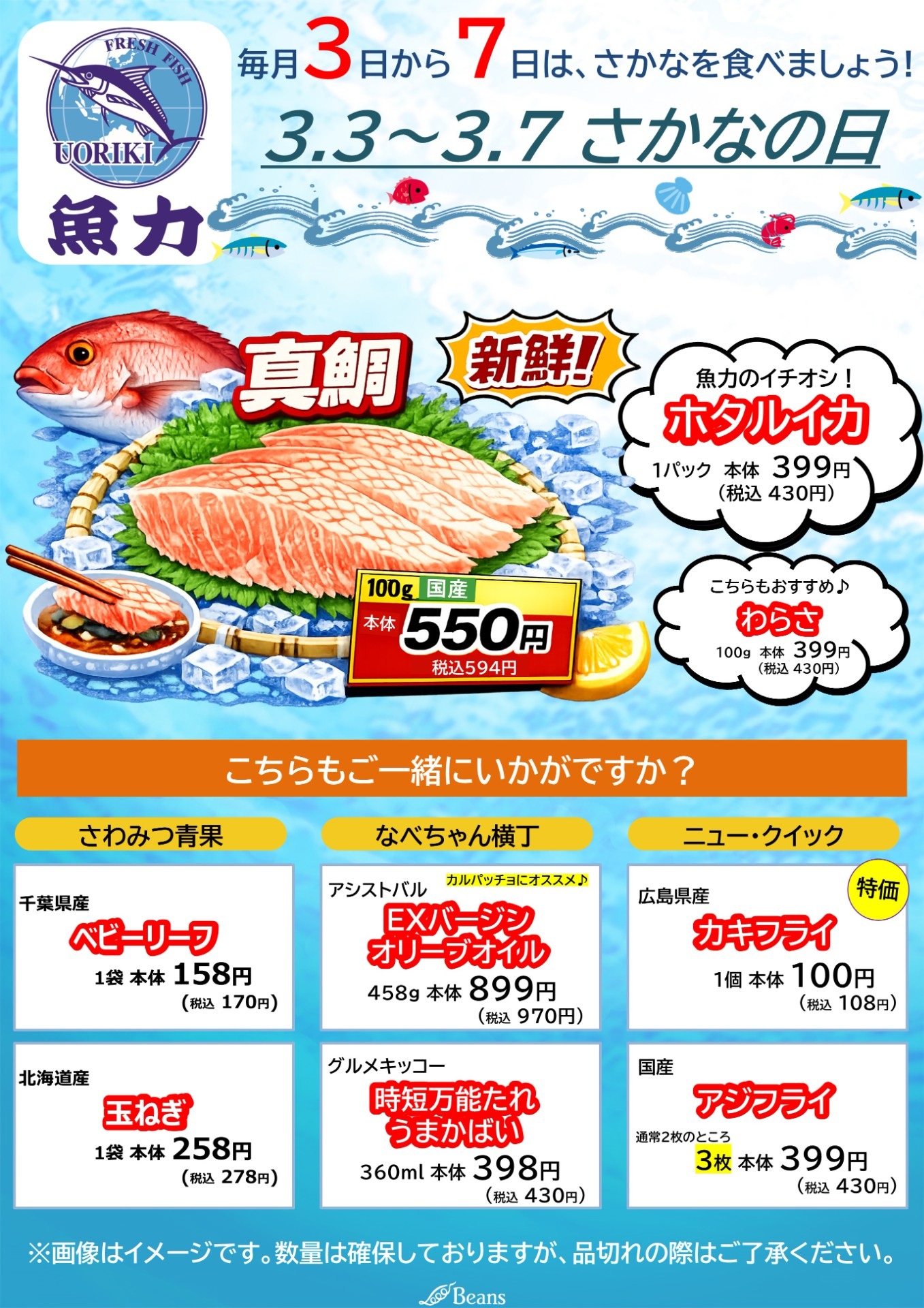 恵まれた海洋環境を有する我が国では、多種多様な魚が漁獲され地域ごとに魚食文化が根付いています。 しかし、世界では食用魚介類の消費量が増加している一方、日本の消費量は減少し続けている状況です。 こうした状況を踏まえ、水産物の消費拡大に向けた取組を官民協働で推進するため、水産庁では「さかなの日」を制定しました。 「さかなの日」をきっかけに「さかなを食べること」=SDGs達成に向けた消費行動であることについて知って頂き、 魚を食べることによって、おいしい魚を未来につないでいきませんか。 今月は、「国産真鯛」が旬ですよ! ぜひみなさまのご来店お待ちしております♪