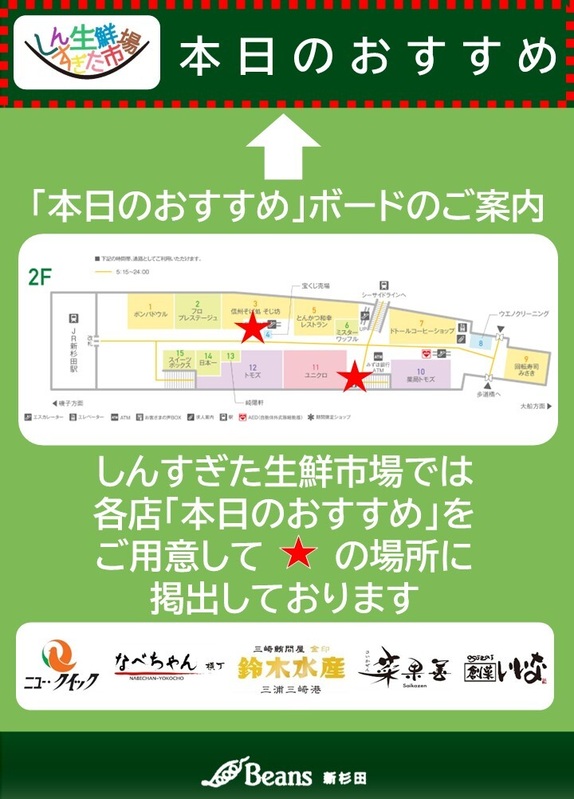 しんすぎた生鮮市場では各店「本日のおすすめ」商品をご用意しています。