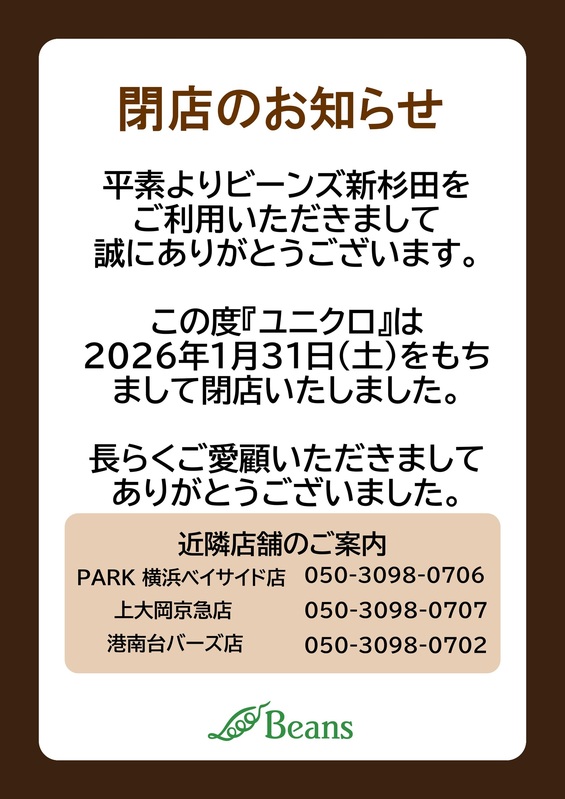 トピックス 閉店のお知らせ 平素よりビーンズ新杉田をご利用いただきまして誠にありがとうございます。この度『ユニクロ』は2026年1月31日(土)をもちまして閉店いたしました。長らくご愛顧いただきましてありがとうございました。 tweetする Facebookでシェアする LINEで送る