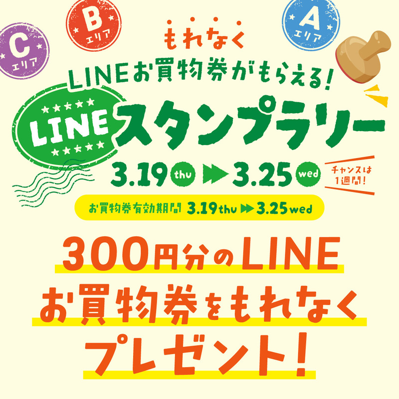 スタンプ3つ集めるとLINE300円お買物券がもれなく当たる!