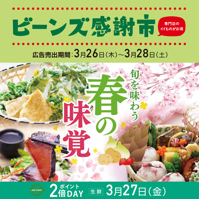 トピックス 【予告】ビーンズ感謝市 3/26(木)~28(土)開催! 3月27日(金)は「しんすぎた生鮮市場」でJRE POINT 2倍DAY 毎月ご好評いただいております「ビーンズ感謝市」を3月26日(木)~28日(土)に開催いたします。 今月は春の味覚を大特集! オトクな商品も多数取り揃えておりますので、ぜひこの機会にご来店ください♪ tweetする Facebookでシェアする LINEで送る