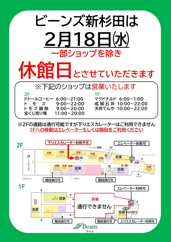 トピックス 休館日のお知らせ 日頃よりビーンズ新杉田をご愛顧いただきまして誠にありがとうございます。2月18日㈬は誠に勝手ながら休館日とさせていただきます。詳細につきましては上記の画像をご確認ください。 開催日時 2026年2月18日㈬ tweetする Facebookでシェアする LINEで送る
