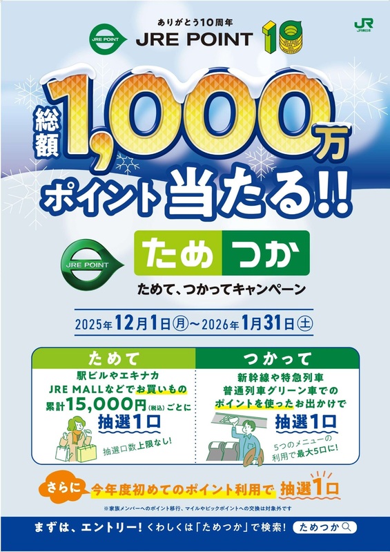 トピックス 【第4弾】JREPOINT10周年記念キャンペーン JREPOINTの10周年を記念して、お得なキャンペーンが盛りだくさんです!また、キャンペーンのご参加にはエントリーが必須となっております。ぜひお早めにご確認・エントリーください! エントリーはこちらから tweetする Facebookでシェアする LINEで送る
