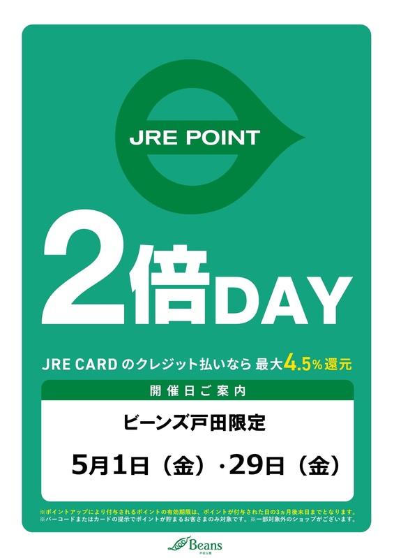トピックス 5月のJRE POINTアップデー! 5月は 1日(金)、29日(金)でJRE POINT 2倍DAYを開催いたします!ぜひおトクなこの機会にお買い物ください✨みなさまのご来店をお待ちしております。 tweetする Facebookでシェアする LINEで送る