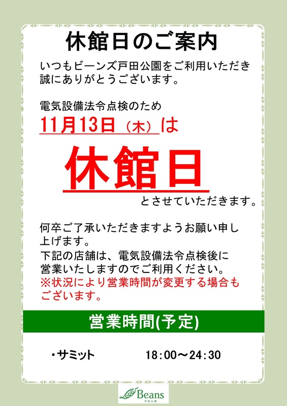 尚、サミットにつきましては点検終了後営業を予定しております。