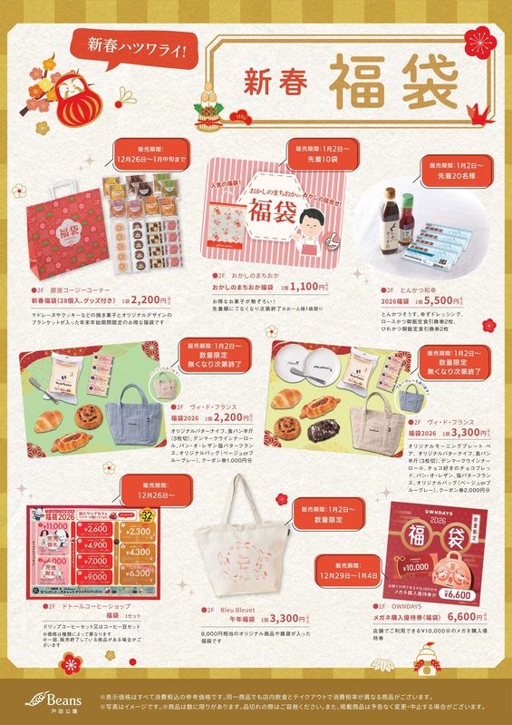 トピックス 福袋販売について ビーンズ戸田公園で1/2(金)から販売する福袋をご紹介します。各商品数に限りがございます。尚、1/2(金)はJRE POINT2倍デーとなっております。是非ご来店下さいませ。 開催日時 1月2日(金)~ 詳しくはコチラ tweetする Facebookでシェアする LINEで送る