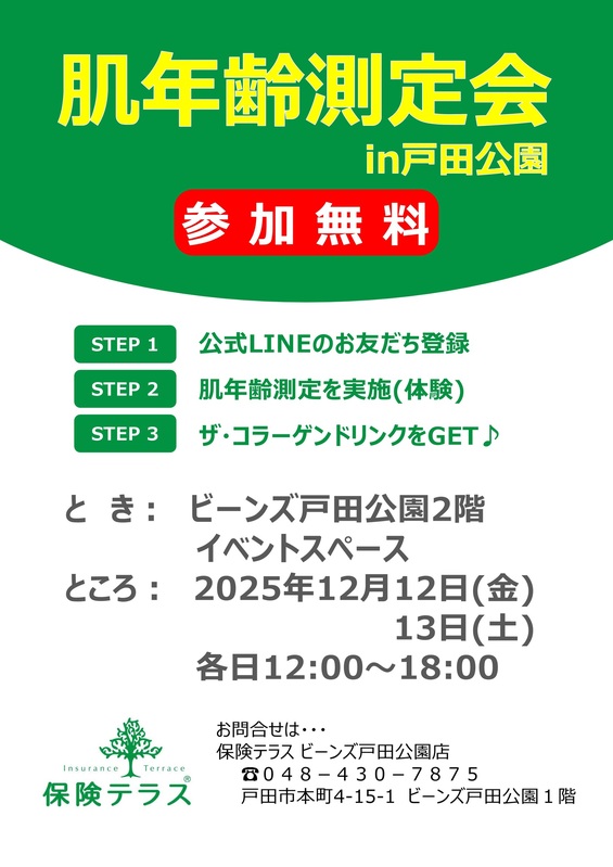 トピックス 【保険テラス】肌年齢測定会 詳しくはポスター又は保険テラスまでお問い合わせください 開催日時 12月12日~13日 各日12:00~18:00 場所 2Fイベントスペース tweetする Facebookでシェアする LINEで送る