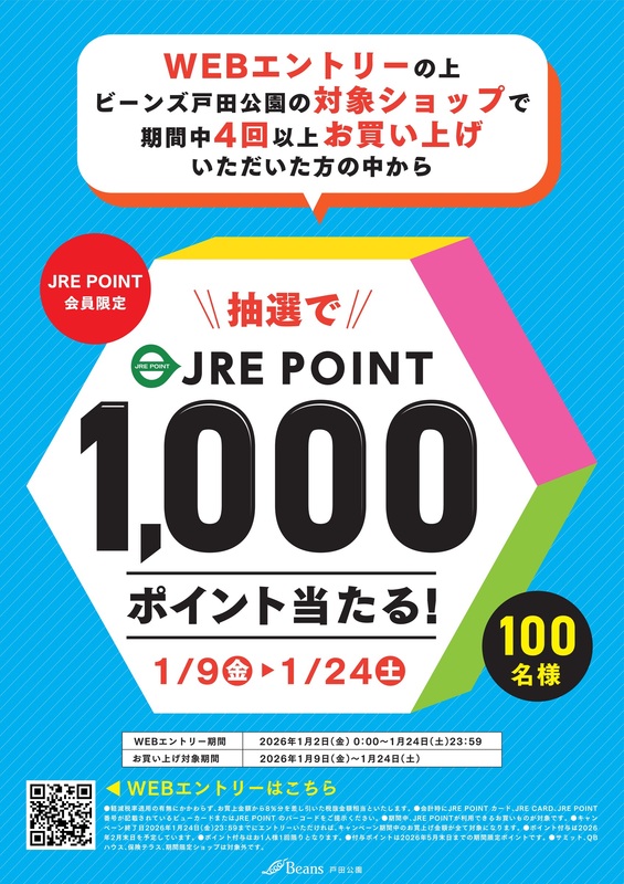 WEBエントリーの上、ビーンズ戸田公園で期間中4回以上お買い上げいただいた方の中から抽選で100名様にJRE POINT1,000ポイントをプレゼント致します。
