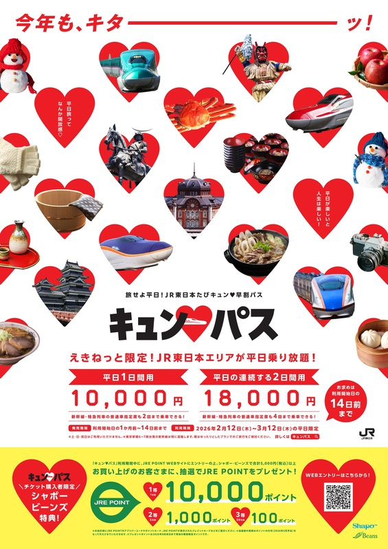 トピックス 【キュン♥パス チケット購入者限定】シャポー/ビーンズ特典! 「キュン♥パス」利用期間中に、JRE POINT WEBサイトにエントリーの上、シャポー・ビーンズで合計5,000円(税込)以上お買い上げのお客様に、抽選でJRE POINTをプレゼント!詳細はWEBエントリーページをご参照下さい。 詳細及びWebエントリーはこちら tweetする Facebookでシェアする LINEで送る