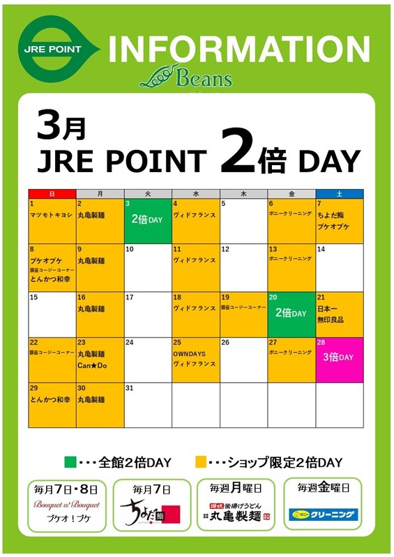 3月のJRE POINTアップデー!|トピックス|ビーンズ戸田公園 | JR埼京線「戸田公園駅」直結のショッピングセンター