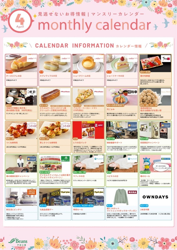 4月マンスリーカレンダー|トピックス|ビーンズ戸田公園 | JR埼京線「戸田公園駅」直結のショッピングセンター