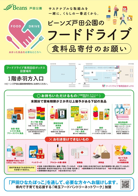 ビーンズ戸田公園としましても、ひとり親家庭等の子どもたちへの食品支援の取り組みを支援していきたいと存じます。余った食品や衛生用品などの寄付をお願い申し上げます。