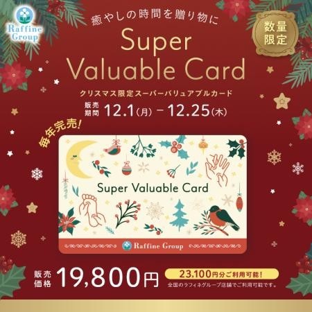 毎年好評のクリスマス限定スーパーバリュアブルカードを今年も数量限定で販売いたします。 販売価格19,800円で、23,100円分ご利用いただけるお得なカードです。 クリスマス限定のスーパーバリュアブルカードなら、全国のラフィネグループの店舗および公式通販ラフィネマルシェでご利用いただけます。 (一部ご利用不可の店舗もございます。) ご購入されたご本人様以外の方でもご利用いただけますので、大切な方へのプレゼントにもおすすめです。 数量限定ですので購入はお早目に!皆様のご来店をお待ちしております。 ※ 有効期間は発行日より3ヵ月(92日後)です。 ※ 有効期限が過ぎたものは、いかなる場合でもご利用いただくことができません。 ※ 本カードの払い戻し・換金・転売はいかなる場合もできません。 ※ 数量限定のため、なくなり次第終了いたします。 ※ 先着順の販売となります。商品のご予約・お取り置きは致しかねます。 ※ 電子マネー、バーコード決済等ご利用いただけないものがございます。