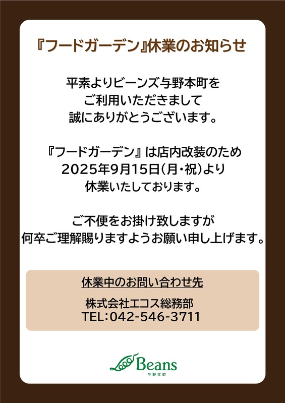 『フードガーデン』休業のお知らせ|トピックス|ビーンズ与野本町 | JR埼京線「与野本町駅」直結のショッピングセンター