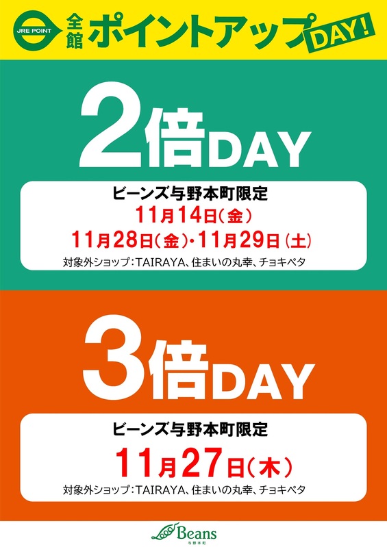 トピックス 11月のJRE POINT アップデー! 11月は14日(金)、28日(金)、29日(土)に2倍デーを開催いたします✨また、27日(木)は3倍デーを開催いたします!!みなさまのご来店をお待ちしております。 tweetする Facebookでシェアする LINEで送る