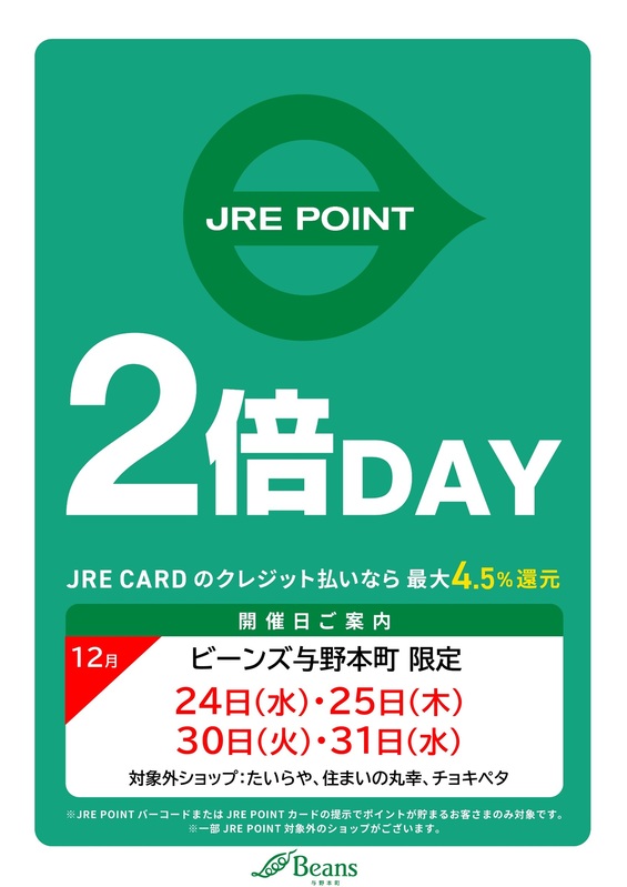 トピックス 12月のJRE POINTアップデー! 12月は24日(水)、25日(木)、30日(火)、31日(水)に2倍デーを開催いたします✨ みなさまのご来店をお待ちしております。 tweetする Facebookでシェアする LINEで送る